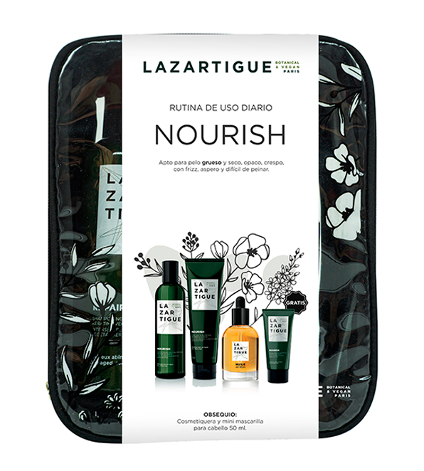 Coffret Daily Use Nourish de Lazartigue es un protocolo de uso diario, ideal para cabello delgado y seco, opaco, crespo, con frizz, aspero y difícil de peinar o pelo ondulado o rizado. Incluye: