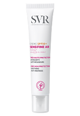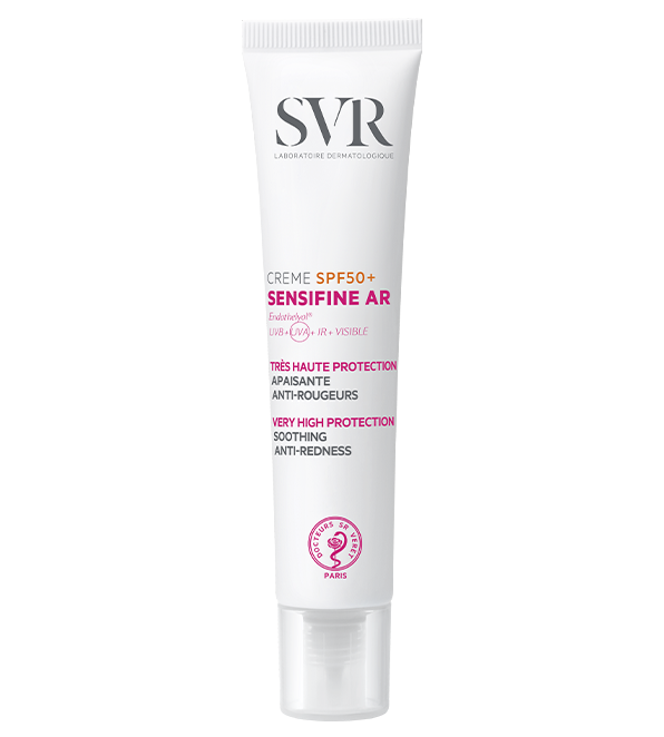 SVR crea SENSIFINE AR Cream SPF50 +, una protección suavizante anti-rojez muy alta, el primer cuidado de la piel 2-en-1 que protege y alivia la piel reactiva con tendencia a la rosácea.