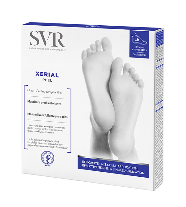 Solicitada permanentemente y con demasiada frecuencia ignorada, los pies son descuidados de la rutina de cuidado ... Aparecen cuerno y callosidades. En respuesta, la RVS innova y crea Xerial Peel, 1 st * calcetines máscara exfoliante para un nuevo efecto de piel en una sola aplicación . Altamente concentrado en ingredientes activos queratolíticos y emolientes, exfolia e hidrata profundamente. Su técnica de impregnación única permite apuntar solo a las áreas ásperas y engrosadas del pie y preservar las áreas sensibles. Acción rápida y radical para un nuevo efecto de piel en menos de dos semanas ** .